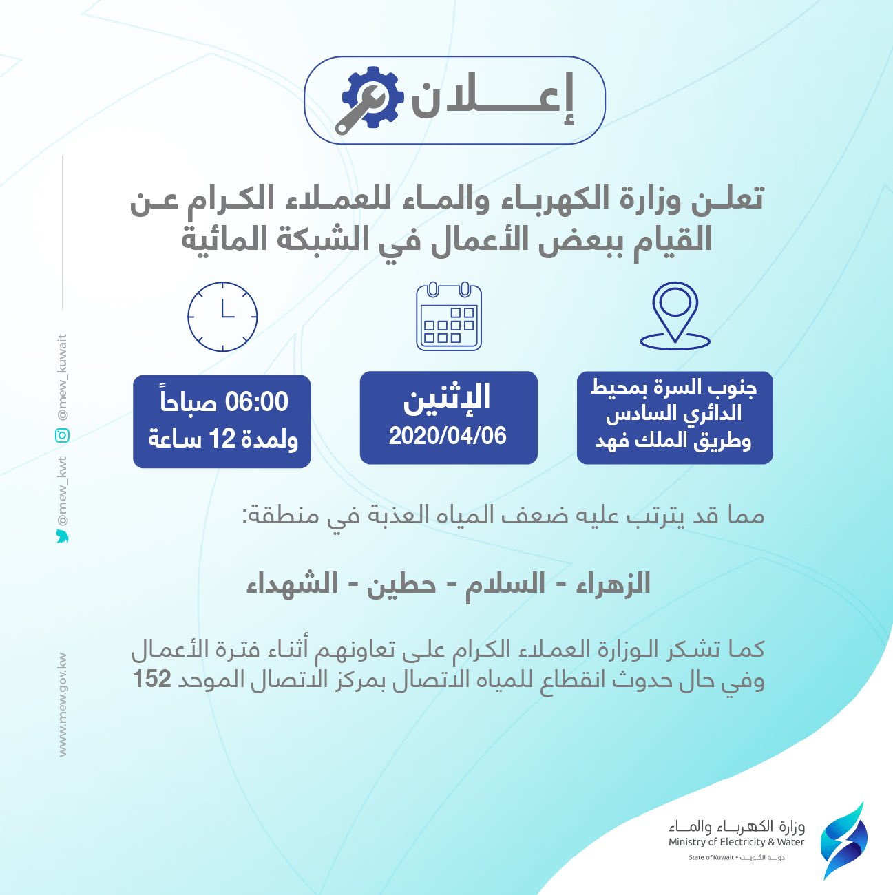 وزارة الكهرباءوالماء On Twitter تذكير بأعمال في الشبكة المائية صباح اليوم الإثنين الموافق 06 04 2020
