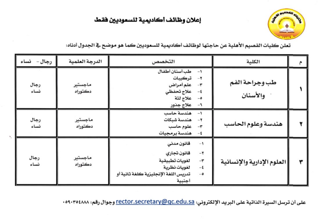 وظائف السعودية On Twitter اعلان وظائف أكاديمية شاغرة للجنسين بكليات القصيم الأهلية في بريدة للسعوديين والسعوديات طب وجراحة الفم والأسنان هندسة علوم الحاسب العلوم الإدارية والإنسانية ترسل السيرة الذاتية