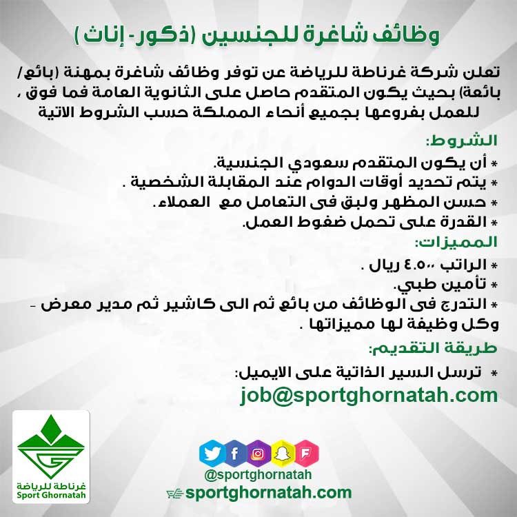 غرناطة للرياضة وظائف بائعين وبائعات برواتب 4500 ريال في اغلب المناطق